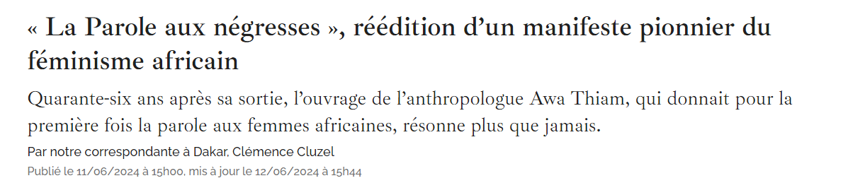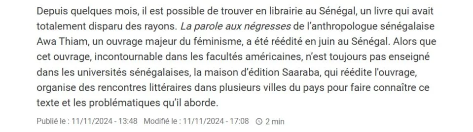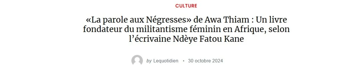 « La Parole aux Négresses », réédition d’un manifeste féministe qui a fait date (lemonde.fr) « La Parole aux négresses », réédition d’un manifeste pionnier du féminisme africain (lepoint.fr) Ndèye Fatou Kane : “ « La parole aux négresses » peut servir de base pour continuer la lutte féministe” (afrolivresque.com) La parole aux négresses : un héritage féministe incontournable, le point avec Dr.Kani Diop (Youtube.com) Réédition d’un ouvrage fondateur du féminisme africain “ La parole aux négresses” d’Awa Thiam à partir de 04:55 sur (Youtube.com) Impressions du 22 juillet 2024 avec Sada KANE à partir de 42:17 sur (Youtube.com) KENKELIBAA - MARDI 30 juillet 2024 à partir de 1:12:35 sur (Youtube.com) VOTRE MATINALE KENKELIBAA - MARDI 22 OCTOBRE 2024 à partir de 38:00 sur (Youtube.com) LES SAVEURS DE L'ECRITURE / INVITEE: NDEYE FATOU KANE, Prefaciere de "LA PAROLE AUX NEGRESSES" - MERCREDI 23 OCTOBRE 2024 (RSI) « La parole aux Négresses » de Awa Thiam, un livre fondateur du militantisme féminin en Afrique, selon l’écrivaine Ndèye Fatou Kane (aps.sn) «La parole aux Négresses» de Awa Thiam : Un livre fondateur du militantisme féminin en Afrique, selon l’écrivaine Ndèye Fatou Kane ( le quotidien) Conversation Littéraire sur « La Parole aux Négresses » de Awa Thiam (Youtube.com/ credit: OR Agency) XIBAAR YI 19H AVEC MOUSSA SENE - ACTUALITE ET POLITIQUE | LUN. 4 NOV. 2024 à partir de 27:17 sur (Youtube.com) Ouvrage majeur du féminisme, «La parole aux négresses» d'Awa Thiam réédité au Sénégal ( rfi.fr) Ndeye Fatou Kane : "Le féminisme n'est pas une guerre contre mais une question de droit..." (Youtube.com/ credit : Ninou On Air) Ndèye Fatou Kane, escritora feminista: “Estoy en contra de ‘hacer pedagogía’ con los hombres” ( elpais.com)